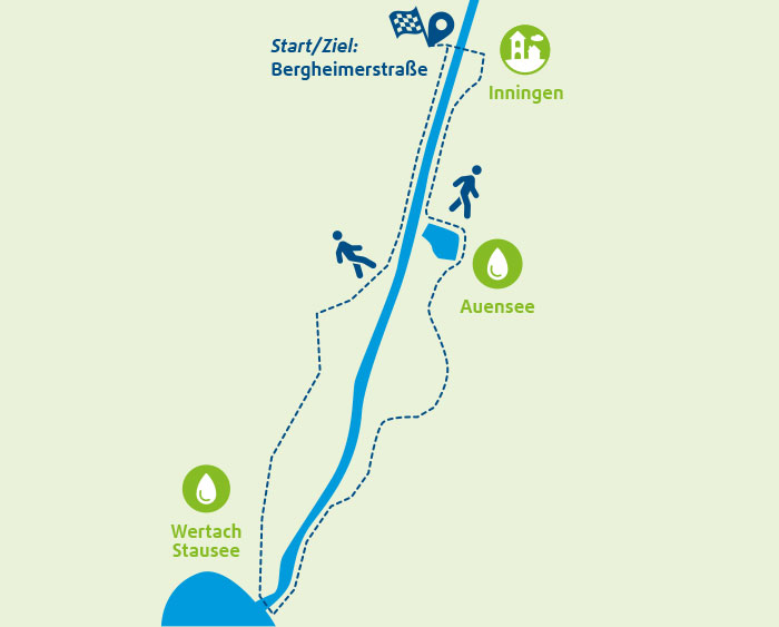 Die idyllischen Wertachauen südlich von Augsburg zählen zu den überregional bedeutsamen Biotopverbundachsen in Bayerisch-Schwaben mit hoher Artenvielfalt. Hier bieten urige Auwälder und Streuwiesen viel Erholungspotential zu jeder Jahreszeit. Ein kleiner Rundweg über rund vier Kilometer Länge startet an der Inninger Bergheimer Straße. Von dort geht’s los in Richtung Wertach.